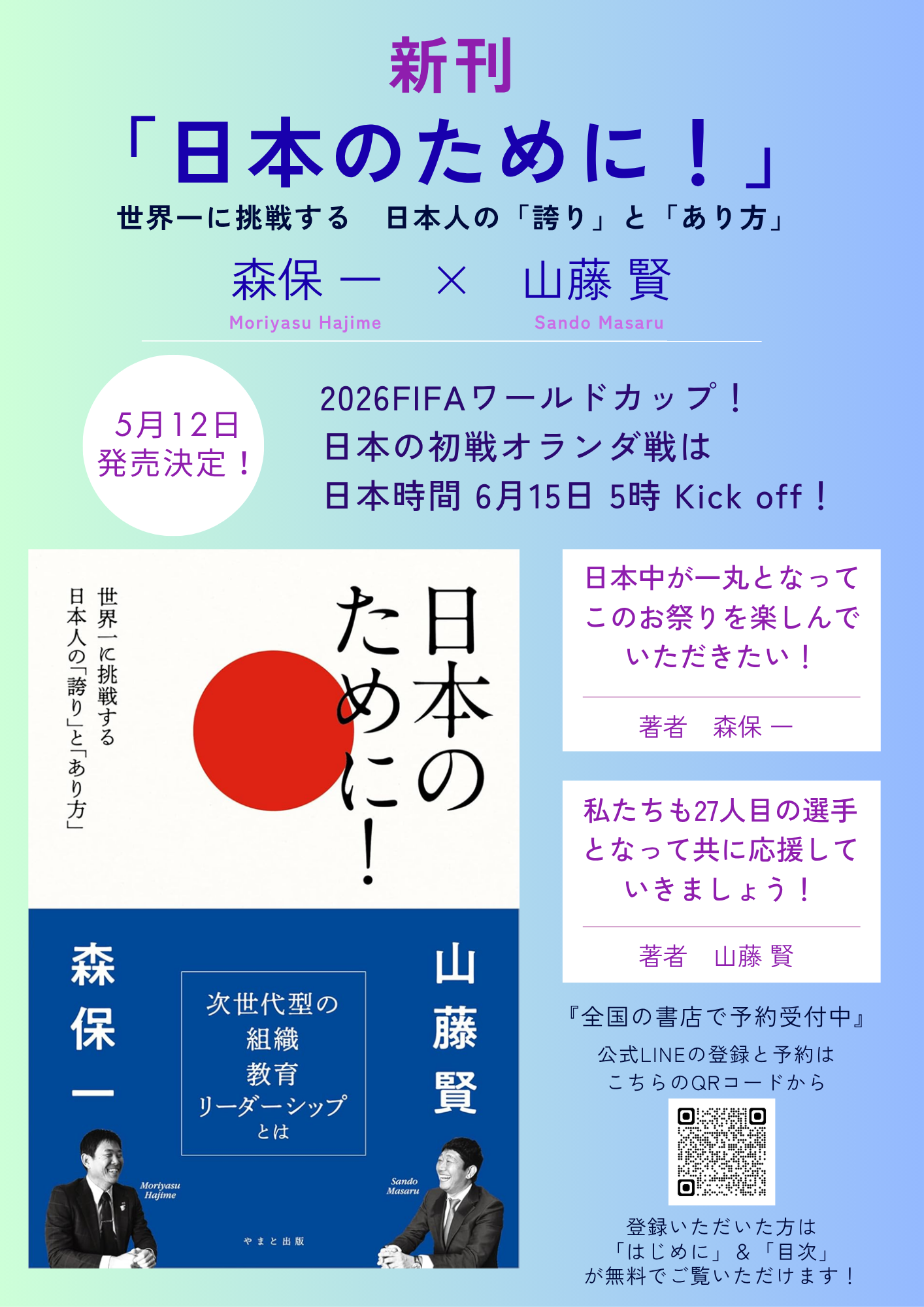 学校長山藤賢とサッカー日本代表監督・森保一氏による共著『日本のために!世界一に挑戦する日本人の「誇り」と「あり方」』が5月12日に発売されることとなりました。