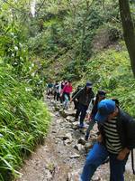 遠足できていた小学生とも触れあいながら、頂上を目指します。途中、沢になっている道もあり、足元がおぼつかない場所もありましたが、声を掛け合いながら、難所(?)も乗り越えて頂上を目指します。